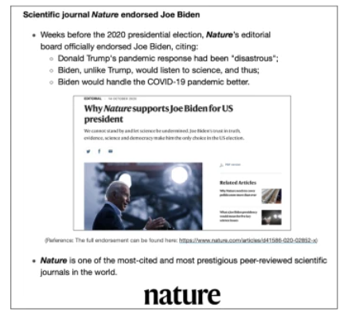 L’auteur de cette étude a réparti au hasard des participants parmi 4000 répondants pour recevoir des informations sur le fait que le journal scientifique Nature a soutenu les actions de Joe Biden pendant la pandémie de COVID-19.