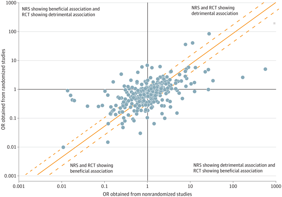 On observe dans le cadrant en bas à gauche que très peu d’études randomisées comme non randomisés trouvent des effets bénéfiques, et très peu d’études dans le cadrant haut à droite trouvent d’effets négatifs. En fait, dans la plupart des cas, les études randomisées n’ont aucun lien avec les études non-randomisées. Pire, dans 37% des cas, elles donnent des effets opposés (ils sont dans le cadrant bas-droite).