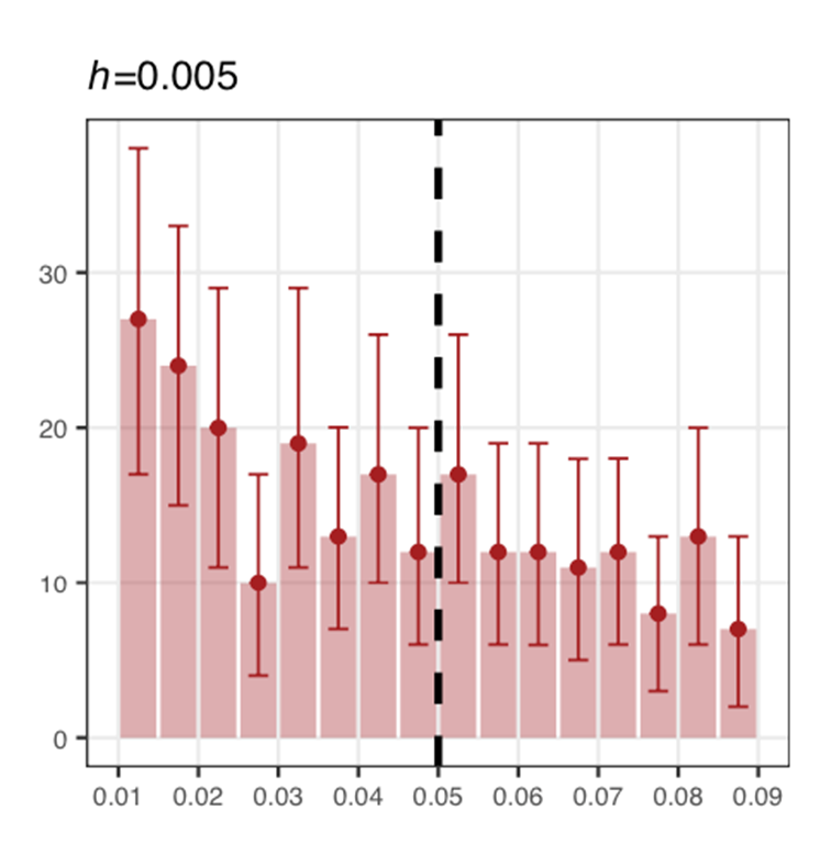 Ici, on n’observe pas d’augmentation sur la gauche de 0.05, indiquant l’absence de p-hacking.