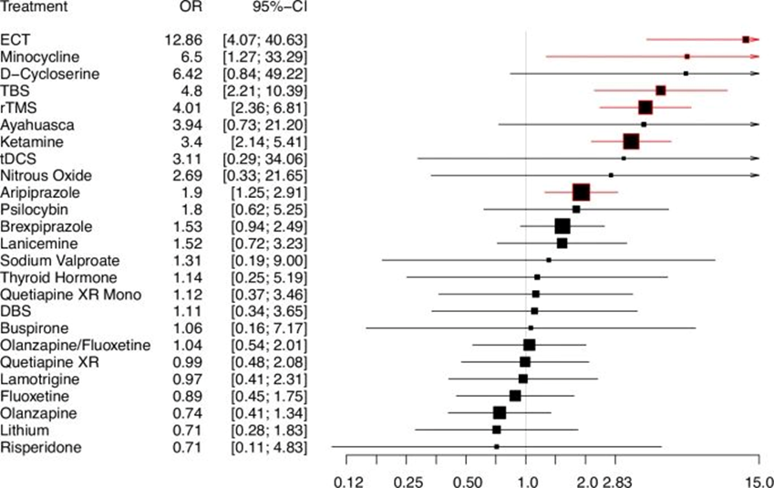 Comme vous le voyez, la majorité des médicaments touchent 1 (pas d’effet). Ceux qui ont eu un effet bénéfique sont en rouge. Parmi eux, ceux dont on est le plus sûr de l’effet ont un carré plus gros. Vous pouvez ainsi constater que le médicament avec le plus gros carré et en rouge est la kétamine (la septième ligne).