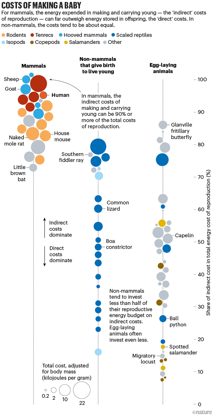 Chez les mammifères, qui utilisent souvent des placentas pour fournir de l'oxygène et des nutriments et pour éliminer les déchets, et qui maintiennent une température corporelle interne stable, les chercheurs ont constaté que les coûts indirects (pour maintenir le placenta en forme) représentaient environ 90 % des coûts énergétiques totaux de la reproduction. Seulement 10 % de l'énergie totale est utilisée pour fabriquer le bébé. Chez l'homme, 96 % des 208 000 kilojoules (soit près de 50 000 kilocalories) nécessaires à la reproduction sont absorbés par les coûts indirects. Vous pouvez le voir dans la figure en haut à gauche.
