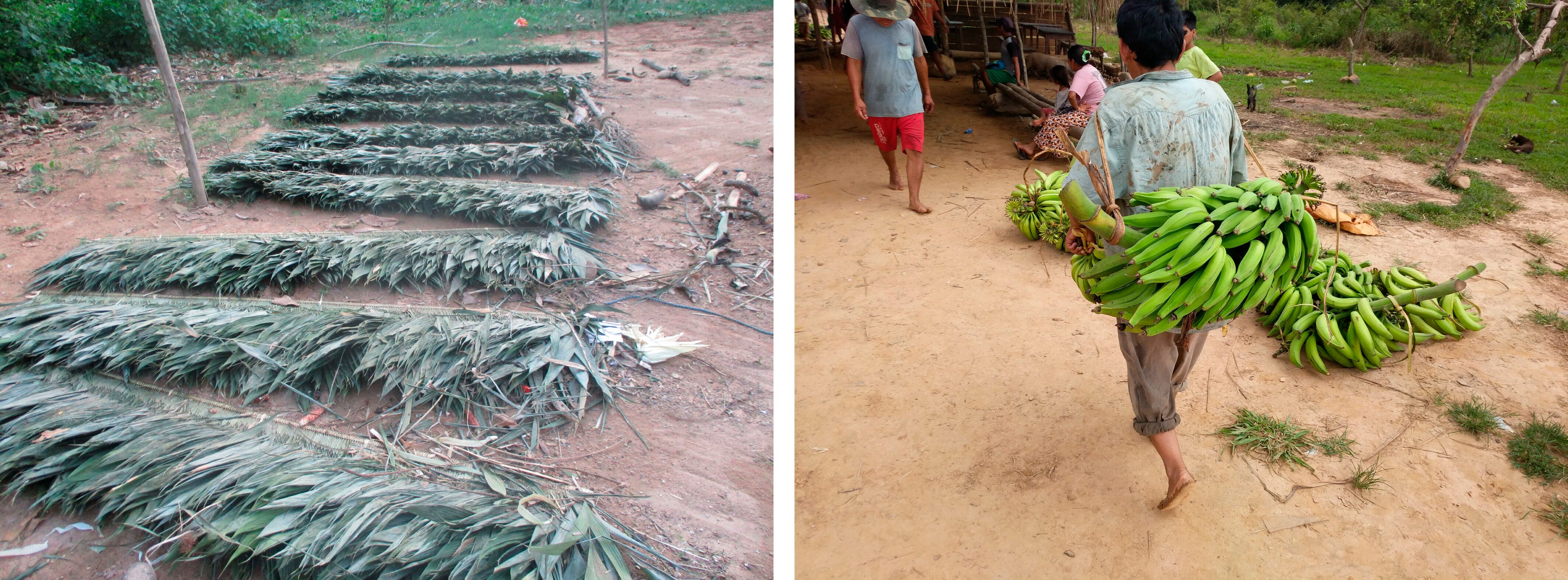 (A gauche) Les feuilles de jatata se vendent 5 bolivianos. Ils sont utilisés pour les toitures des maisons, mais aussi comme monnaie (ils se vendent par 5) pour rembourser les comptes impayés auprès des commerçants fluviaux. (À droite) Les bananes plantains sont également vendues par multiples de 5, en fonction de la taille de la grappe.