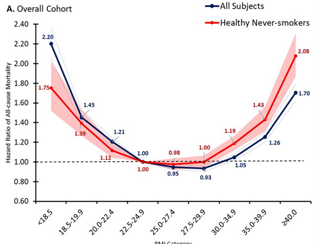 Il y a donc deux choses à retenir de cette étude : le terme « surpoids » est inapproprié pour parler de l’IMC entre 25 et 30, qui semble être un poids tout aussi bon que 20-25 en termes de risque de mortalité, et, contrairement à ce qu’indique le Courrier international (et d’autres journaux), l’IMC est un très bon indicateur des risques de mortalités si on s’intéresse à un IMC supérieur à 30.