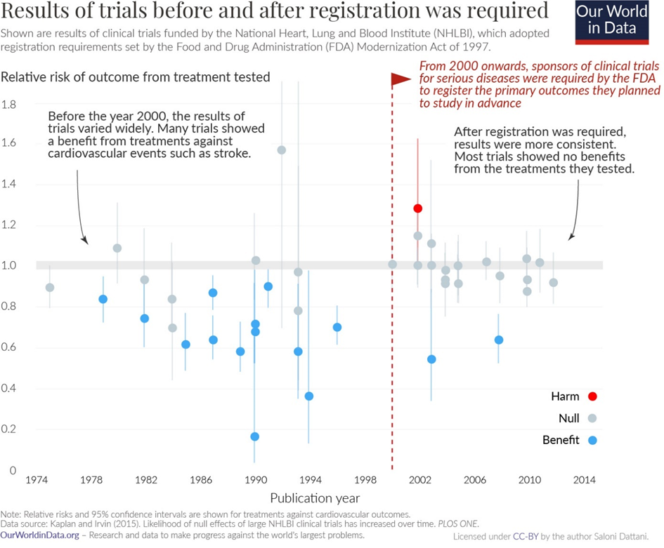 Sur Our World In Data : « Avant 2000, lorsque l'enregistrement préalable des études n'était pas obligatoire, la plupart des médicaments candidats destinés à traiter ou à prévenir les maladies cardiovasculaires présentaient des avantages importants. Mais la plupart des essais publiés après 2000 n'ont montré aucun bénéfice».