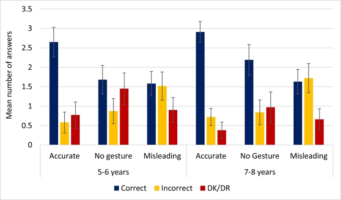 Légende : on observe une réduction drastique de la barre bleue entre “accurate” et les autres, à 5/6 ans, mais aussi 7/8 ans, et une augmentation de la barre jaune entre “no gesture” et “misleading” indiquant plus d’erreurs lorsque le geste était trompeur.
