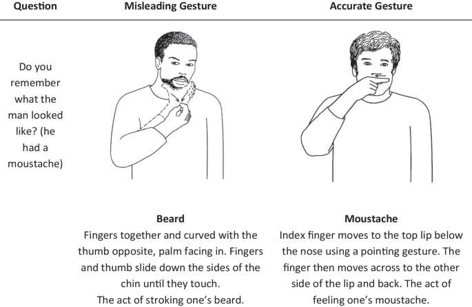 Les gestes induisent-ils des faux souvenirs ? L'étude présentée a été conduite sur des enfants de 5 à 8 ans. Ils devaient regarder une courte vidéo de femmes faisant de la gymnastique, puis répondre à trois questions relatives à ce qu'elles faisaient. Pour certaines questions, l'expérimentateur ne faisait pas de gestes et pour d'autres, il faisait des gestes. Par exemple, quand il demandait de “décrire le juge derrière la gymnaste”, il pouvait garder les mains sur la table ou faire une sorte de barbe avec sa main (alors qu'il a une moustache).