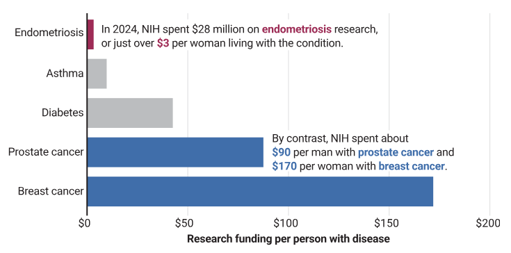 L'endométriose est tellement connue qu'on ne sait même pas estimer sa prévalence. Cependant, elle serait plus élevée que le diabète ou l'asthme aux USA (possiblement de 11%, pour 10% de diabète et 9% d’asthme). Malgré tout, elle est largement moins financé.