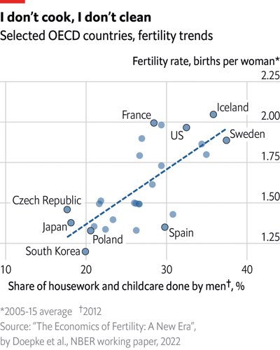 Graphique montrant une corrélation très forte : plus, dans le pays, l’homme s’implique à la maison, plus le nombre d’enfants par femme est important.