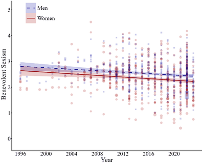 Ce phénomène a été observé dans une méta-analyse. Les chercheurs font cependant une distinction entre deux types de sexisme, le sexisme hostile et le sexisme bienveillant. Le sexisme bienveillant est un terme utilisé par les auteurs pour parler d’attitudes positives qui maintiennent les inégalités. En faisant un suivi longitudinal entre 1996 et 2023 les auteurs indiquent que ces deux formes baissent, et que l’acceptation des attitudes sexistes baisse également. Cette baisse est cependant relativement faible.