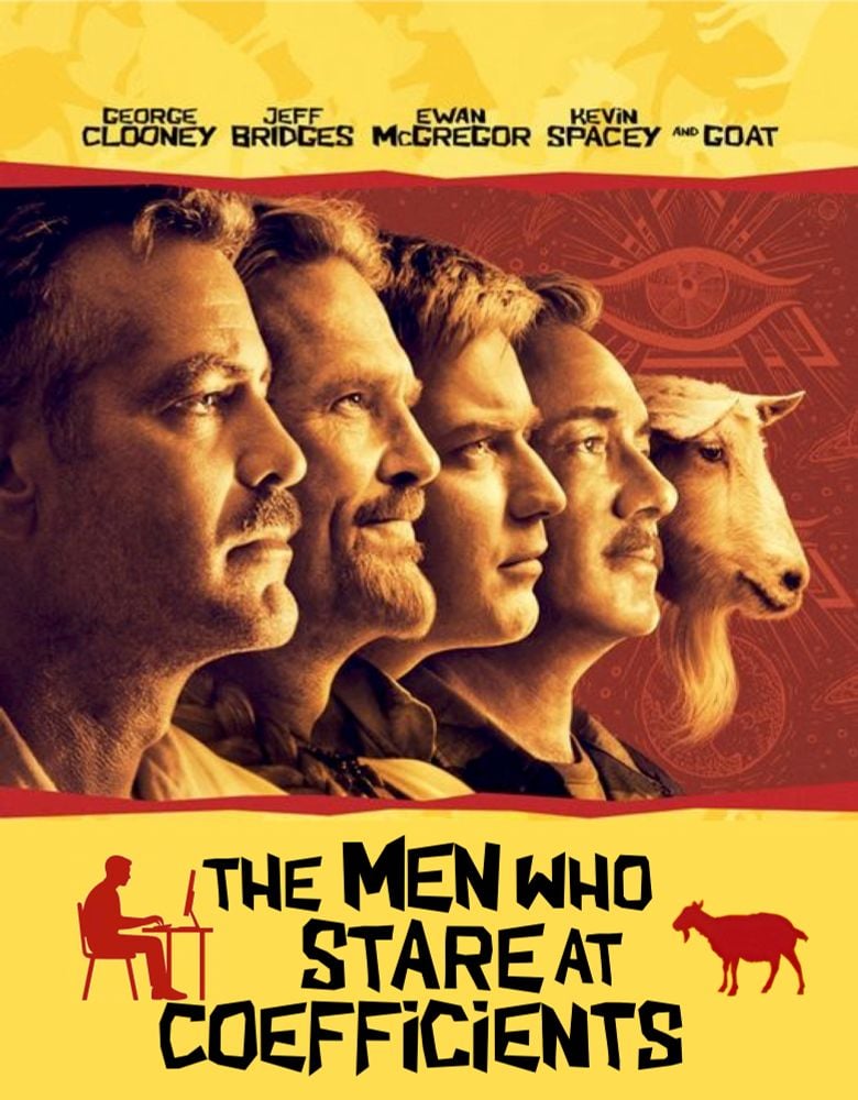 Affiche de film dont le titre serait “Les hommes qui regardent fixement les coefficients” - Auteur inconnu qui se moque des chercheurs qui ne font que regarder les tableaux de stats.