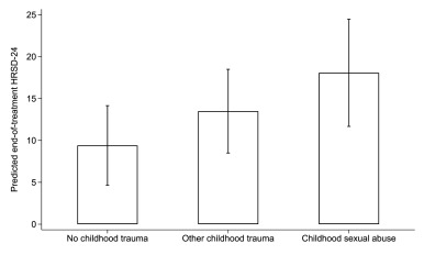 En ordonné se trouvent les résultats prédits au score de l’échelle de dépression à la fin du traitement. On observe que le score prédit est plus élevé pour les participants ayant vécu une enfance avec abus sexuel, signifiant qu’avoir vécu un abus sexuel dans l’enfance « réduit » l’efficacité de la thérapie d’électroconvulsivothérapie dans la dépression.