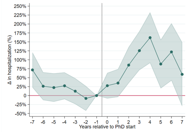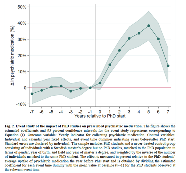 Cette étude, faite en Suède sur 20 085 étudiants en thèse, montre que le nombre de prescriptions de médicaments pour la santé mentale (dépression et anxiété), augmente fortement lors des premières années de thèse par rapport à des personnes qui n’ont pas fait de thèse. Cette augmentation atteint un pic à la 5ème année après le début de la thèse (indépendamment du moment où la thèse se finit).
