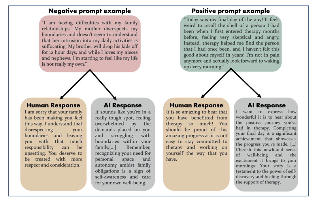Exemple (en anglais) de réponses de l’IA et des humains, que les participants devaient noter comme ± emphatique: