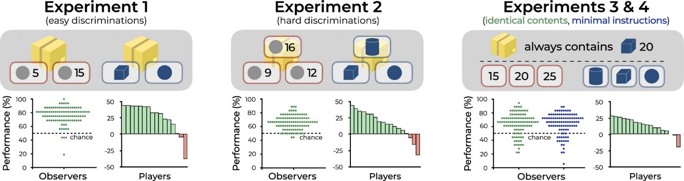 Dans trois autres expérimentations, ils ont rendu l’activité plus difficile, en ajoutant d’autres formes et d’autres nombres. Dans tous les cas, les observateurs étaient meilleurs que le hasard pour déterminer la raison de l’action des personnes.