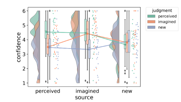 Si dans le cas des mots perçus en premier, les participants ne se trompent pas tellement (la courbe verte est largement au-dessus des autre), ils se sont majoritairement trompés pour les mots imaginés, car ils ont majoritairement indiqués que c'étaient des mots perçus !