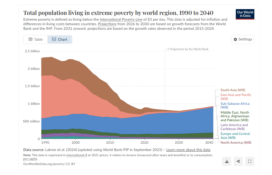 Il semblerait que depuis quelques années, l’extrême pauvreté ne diminue plus, voire progresse légèrement notamment en afrique sub-saharienne. Plus d’informations : https://ourworldindata.org/end-progress-extreme-poverty