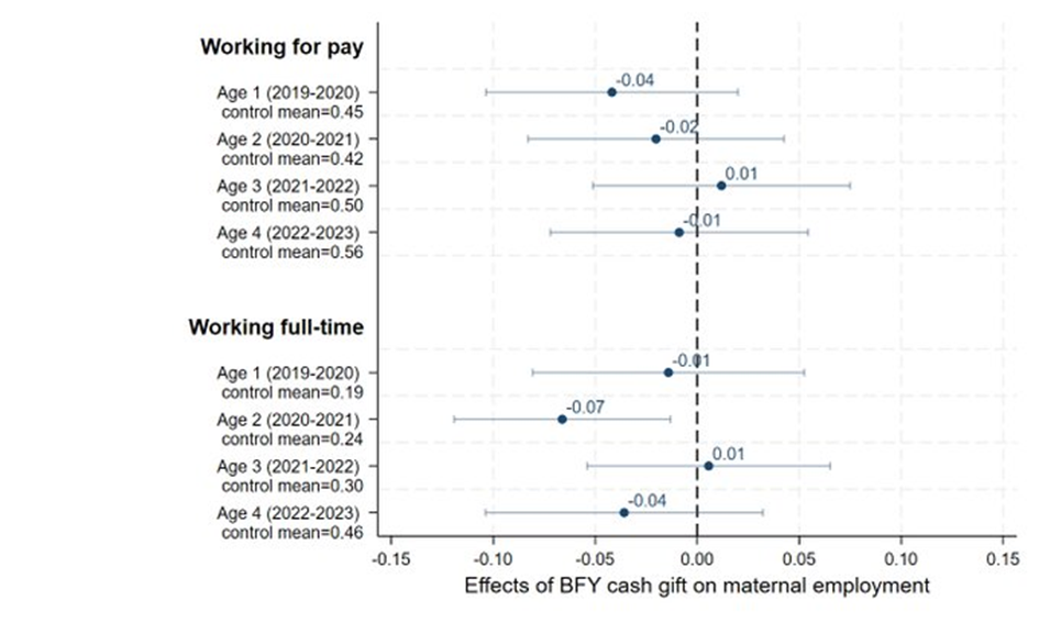 Source : Sauval, M., Duncan, G. J., Gennetian, L. A., Magnuson, K. A., Fox, N. A., Noble, K. G., & Yoshikawa, H. (2024). Unconditional cash transfers and maternal employment: Evidence from the Baby’s First Years study. Journal of Public Economics, 236, 105159. https://doi.org/10.1016/j.jpubeco.2024.105159