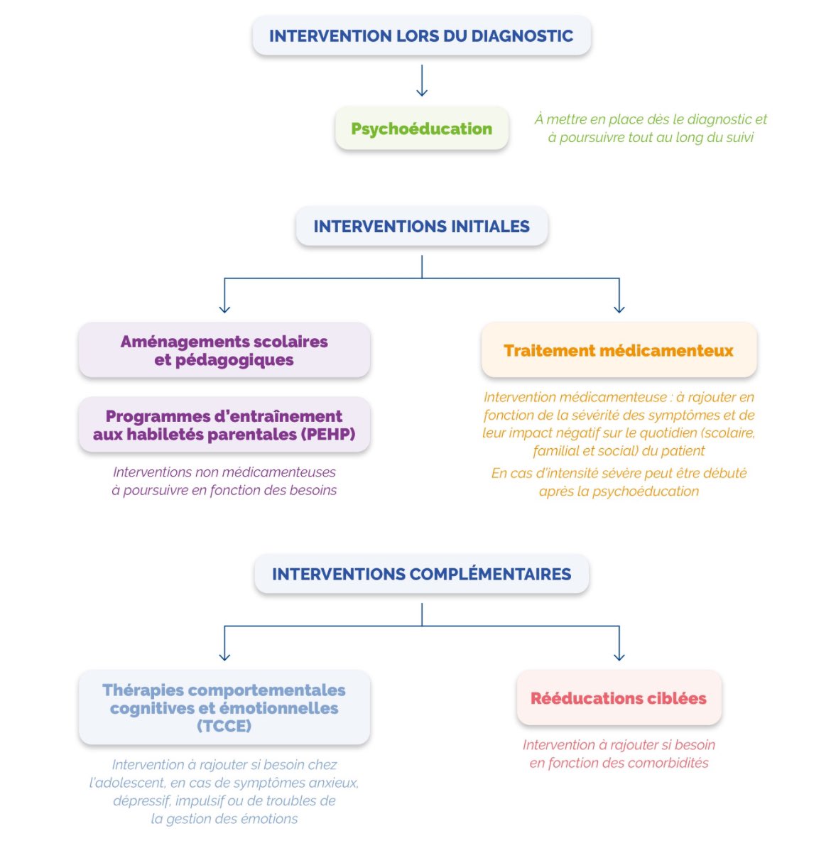 Si médicamentation, on recommande le méthylphénidate, mais uniquement si la sévérité des symptômes et l’impact sur le quotidien de l’enfant est important. Pour le reste, vous avez l’arbre de décision ci-dessous :