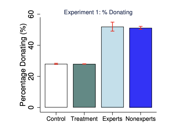 Aux USA, il est commun de faire des "thank you calls", des appels pour remercier les donateurs à des associations. L'idée est qu'en les remerciant, on pense qu'on va augmenter les donations par la suite. Les membres des associations comme les chercheurs pensent que c'est une technique très efficace pour augmenter les donations. Une étude à grande échelle montre qu'en fait, c'est pas le cas. Voici un graphique qui montre bien la grande différence entre ce que pensent les "experts" et les non-experts en bleu et les donations réelles en blanc et vert.