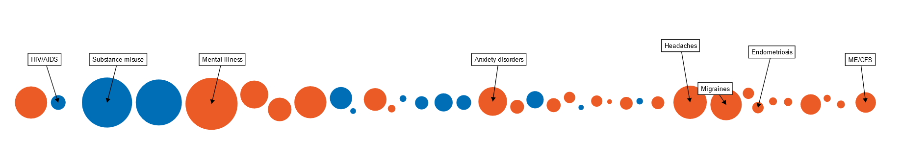 En orange, on retrouve les troubles qui affectent majoritairement les femmes, en bleu les hommes. La taille de la boule indique le nombre de personnes au total (homme et femme) affectés par la maladie. À gauche se retrouvent les troubles les plus financés, à droite les moins financés. C'est assez clair qu'on a presque que du bleu à gauche... et que de l’orange à droite... De plus, les troubles qui affectent le plus les femmes, trouble mental excepté (les gros ronds oranges, mal de tête et migraine) font partie des moins financés au total. Révoltant.