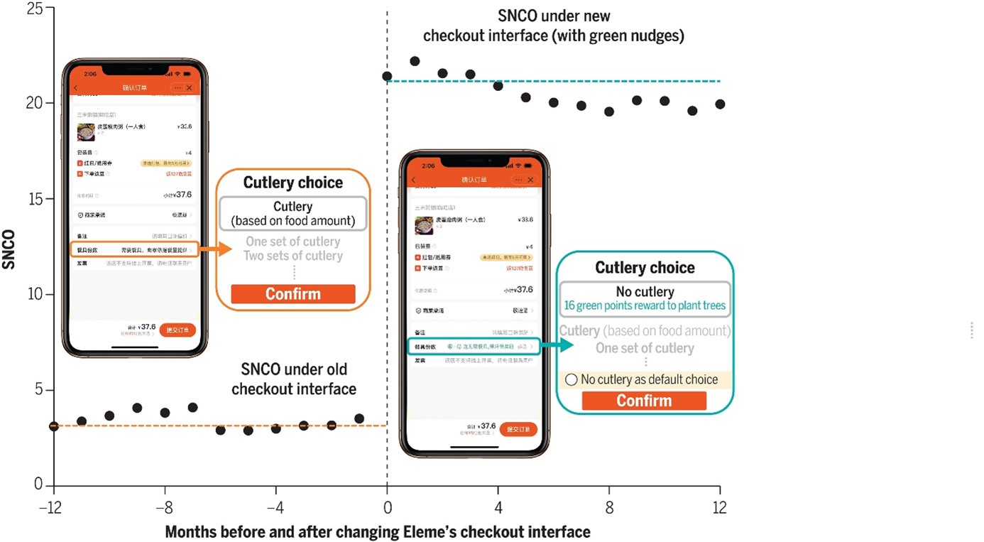 Des chercheurs se sont associés à Alibaba pour modifier le choix par défaut de couvert dans les ventes de nourriture à emporter. Plutôt que de proposer systématiquement des couverts, l’application propose de ne pas prendre de couverts par défaut, en laissant l’utilisateur cliquer sur les couverts s’il en a besoin. Si l’utilisateur ne prends pas de couverts, il est récompensé par de « points verts ».